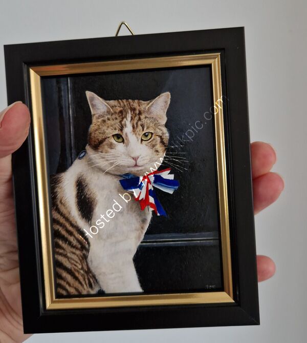 Larry on duty outside Number 10 Downing Street. The most famous Battersea rehomed cat? I thought he deserved an unofficial oil miniature painting.