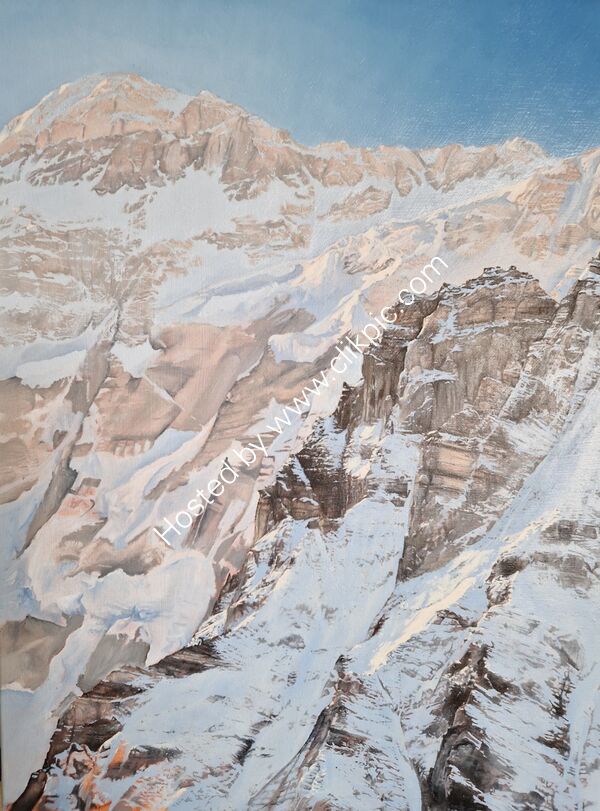Kanchenjunga is also known as "the five treasures of the snow" referring to its five summits. I decided to make a start on the background, before finishing the foreground. I,ve given the sky a second coat, and am working on the snow detail, this should lighten the background.